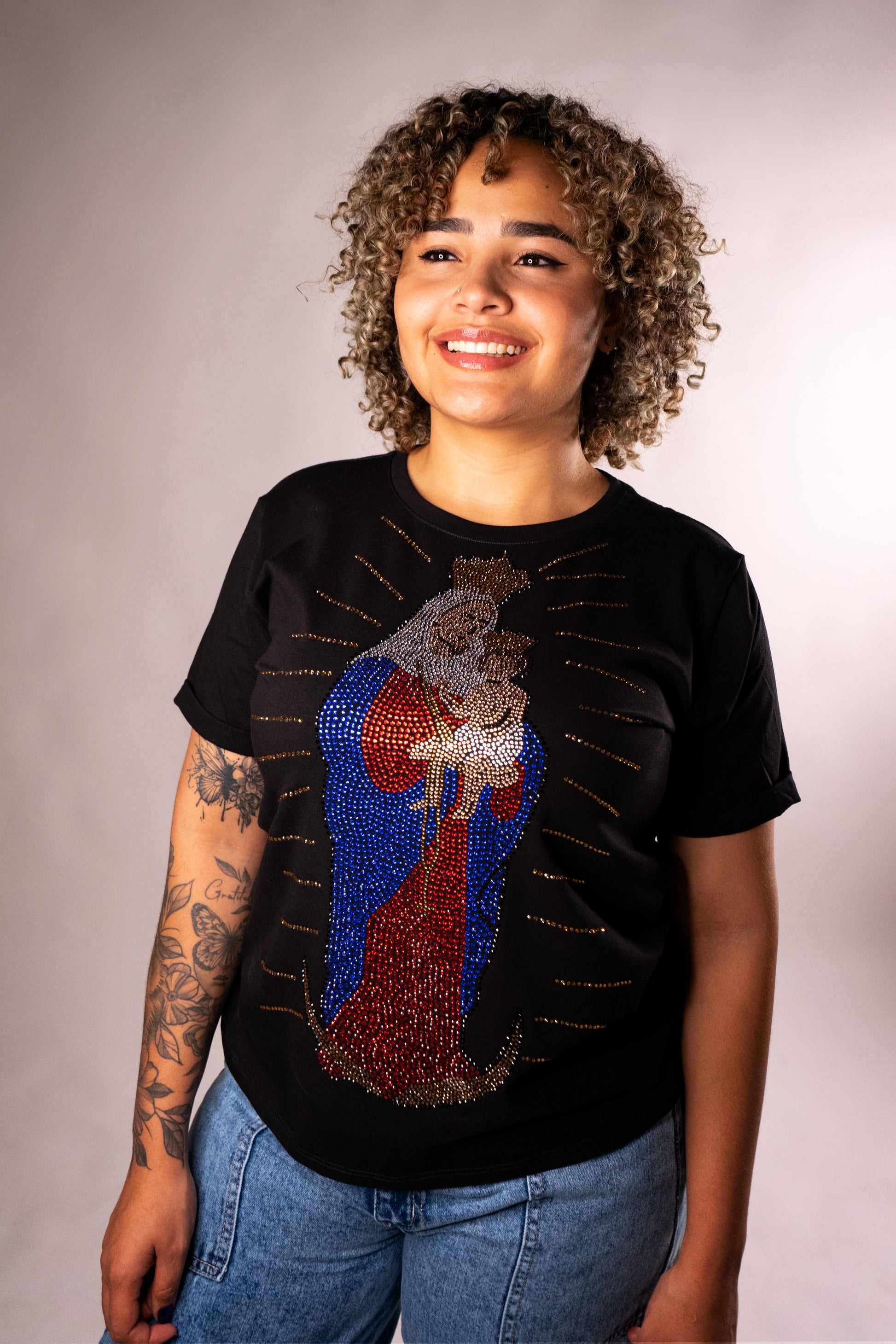 Inspired by tradition, this black t-shirt features a dazzling, shimmering design. Rolled sleeves for a modern touch. Comfortable and stylish, perfect for any occasion.